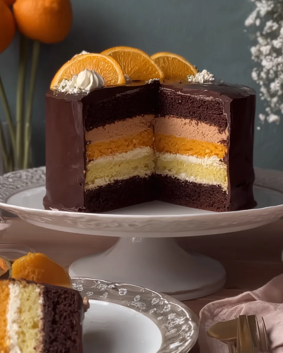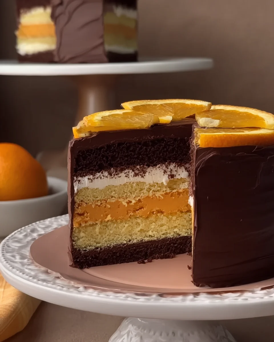 After cooling, spread chocolate ganache between the layers and on top of the cake. Garnish with fresh orange slices for an extra splash of color and flavor.