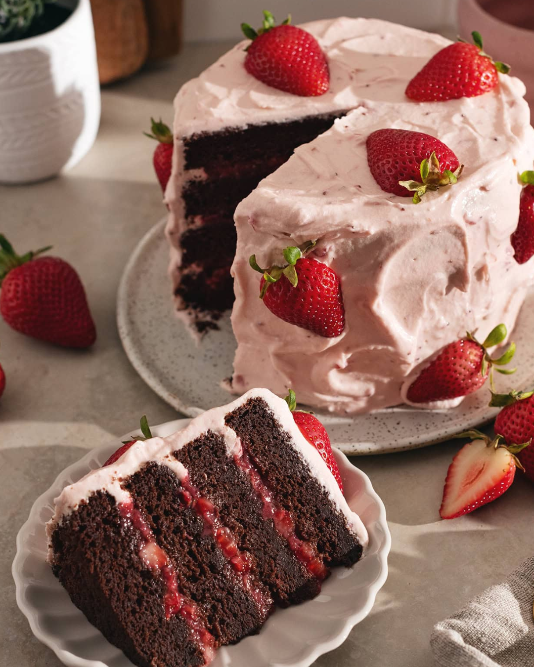 There are many chocolate cake recipes out there, but this one stands out because of the fresh strawberry element layered throughout.