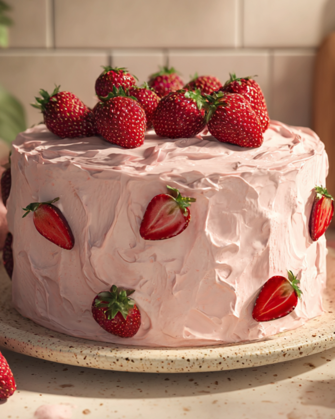 Fresh strawberries add texture between layers and give the cake a vibrant, professional finish.