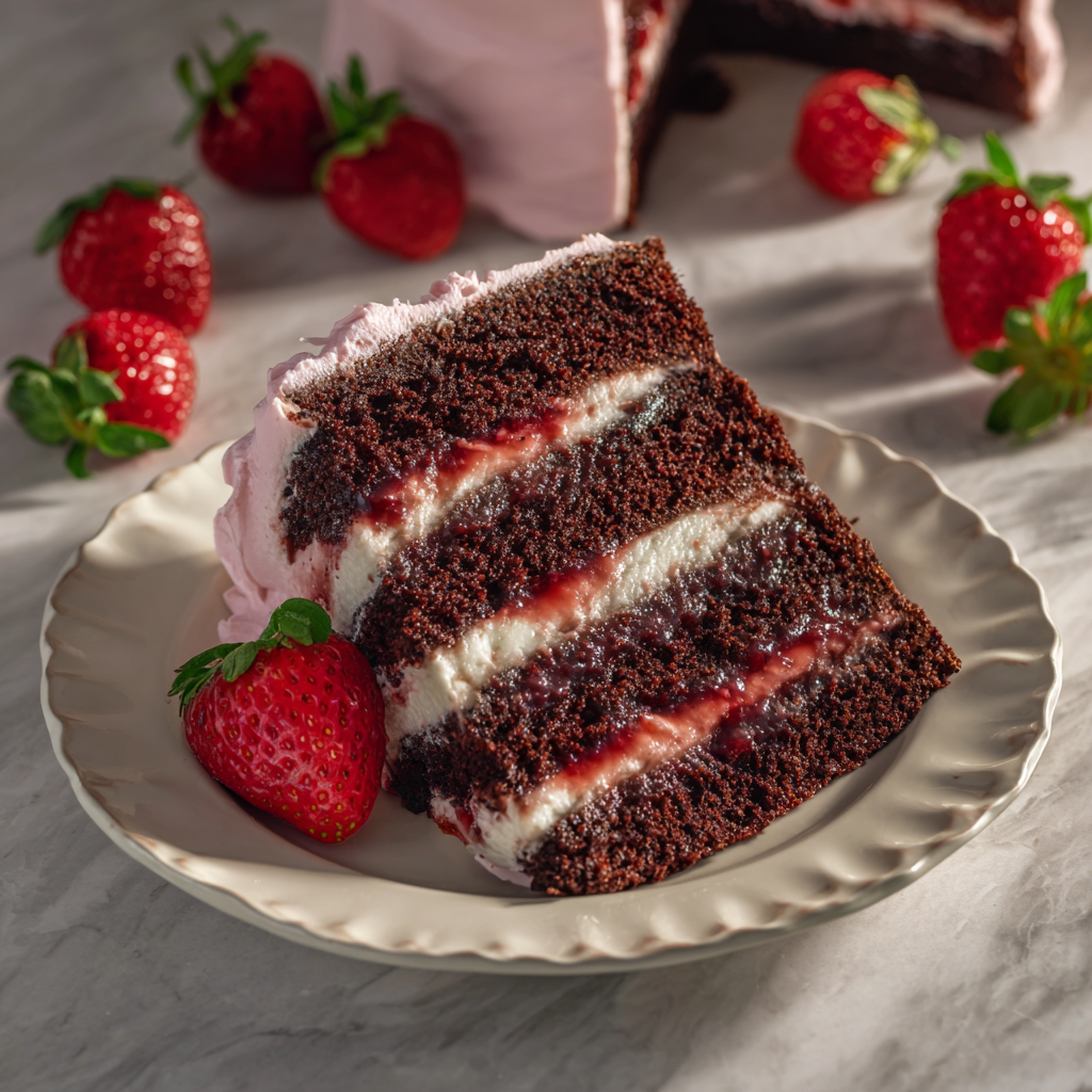 This cake is perfect for birthdays, anniversaries, Valentine’s Day, baby showers, or any celebration that calls for something elegant yet comforting. The combination of deep cocoa flavor and sweet strawberry filling creates a balanced dessert that feels both indulgent and refreshing.