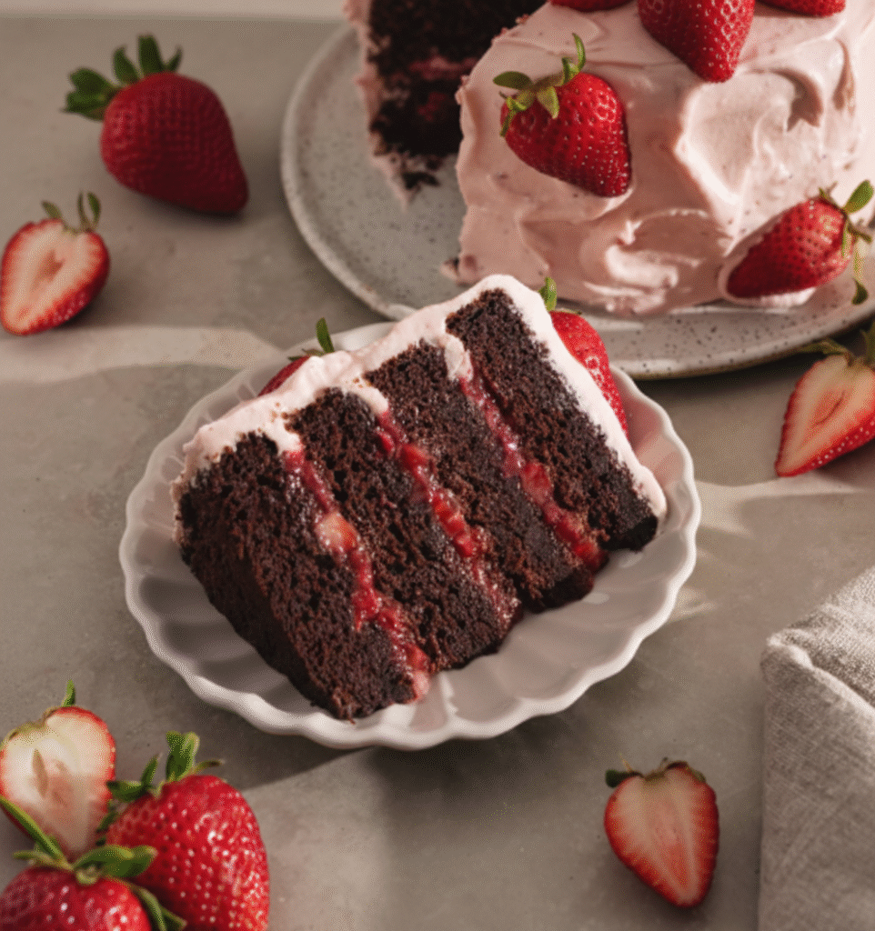 This cake is perfect for birthdays, anniversaries, Valentine’s Day, baby showers, or any celebration that calls for something elegant yet comforting. The combination of deep cocoa flavor and sweet strawberry filling creates a balanced dessert that feels both indulgent and refreshing.